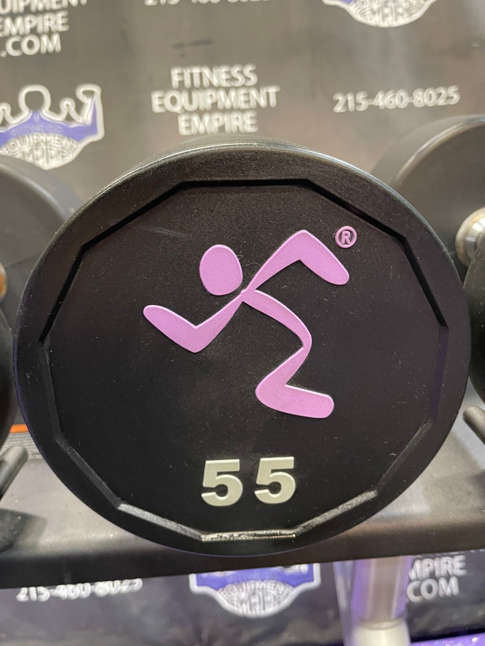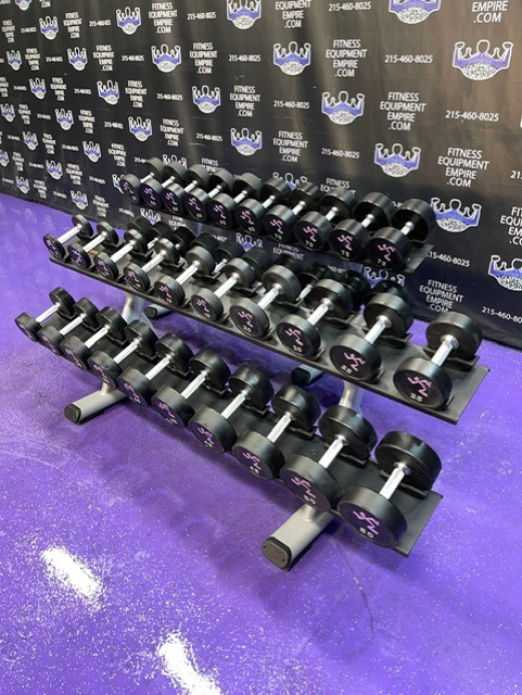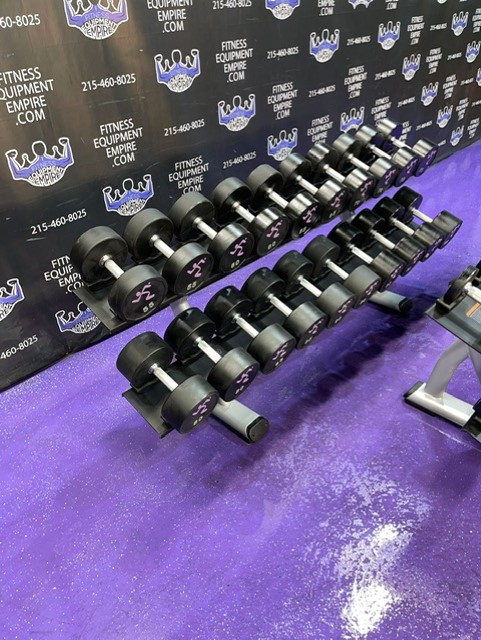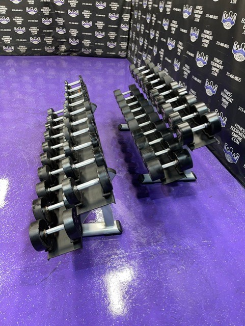 5-100 lb. rubber covered dumbbell set w/2 matching Precor racks. These dumbbells are in excellent condition. There is no wear at all on the rubber itself. Full commercial grade set from an Anytime Fitness that never reopened after the pandemic. This set was purchased new for twice the price of our ask.