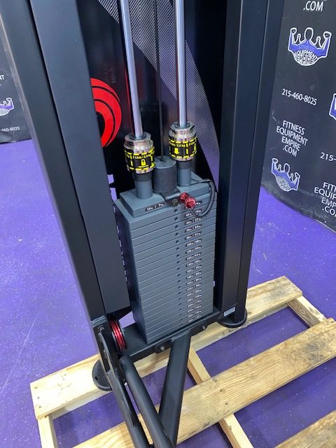 BRAND NEW Empire 8-stack jungle gym/cable crossover with 320 lb. weight stacks! 2.5” x 4.5” rugged, 11-gauge steel and oval tubing for that extra beefy appearance. Unit has high tension cables; multi chin grips that are fabricated with smooth rubber and finished with high-tech aluminum ends and collars. Stations interchange around the central hub for a possible 12-stack, L-shaped jungle gym. Options allow the substitution of 2 hi/low adjustable pulley columns replacing the tricep press down stations found on the Deluxe 8-stack version B (MDM-8SB).