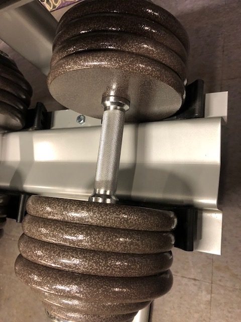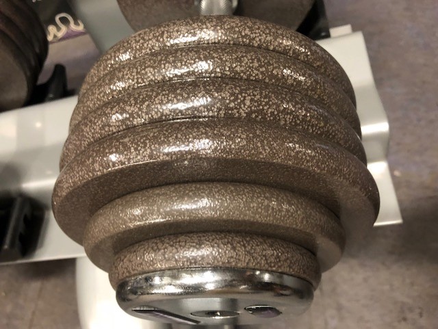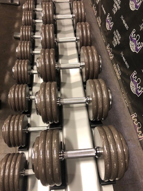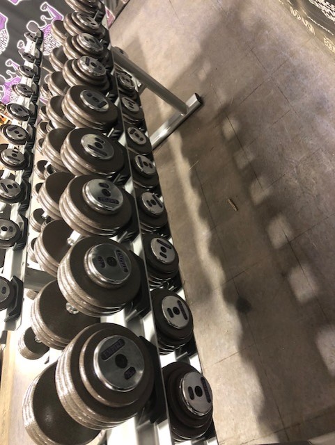 5-100 lb. rubber covered dumbbell set w/2 matching Precor racks. These dumbbells are in excellent condition. There is no wear at all on the rubber itself. Full commercial grade set from an Anytime Fitness that never reopened after the pandemic. This set was purchased new for twice the price of our ask.