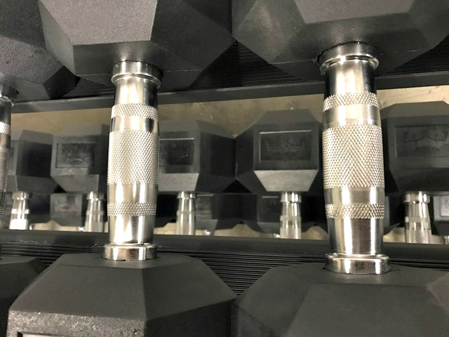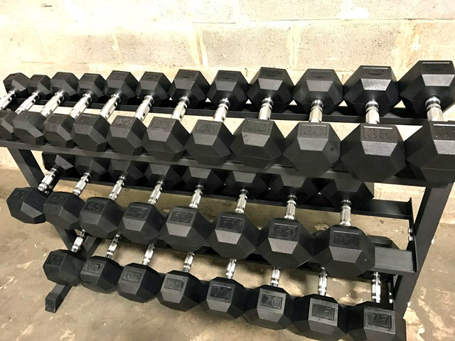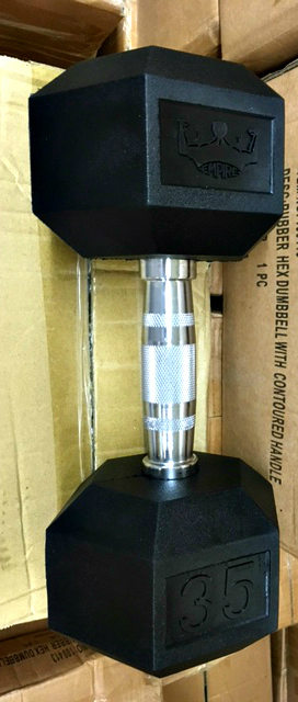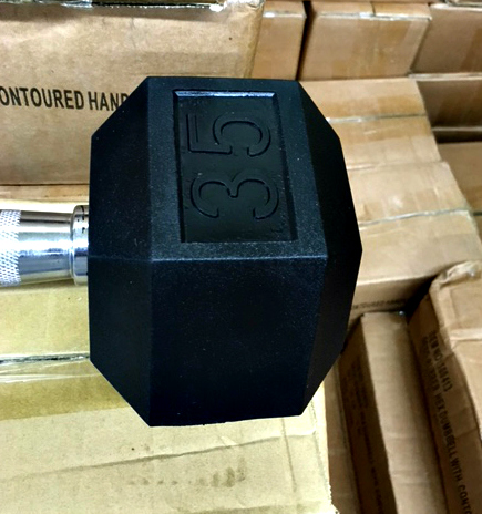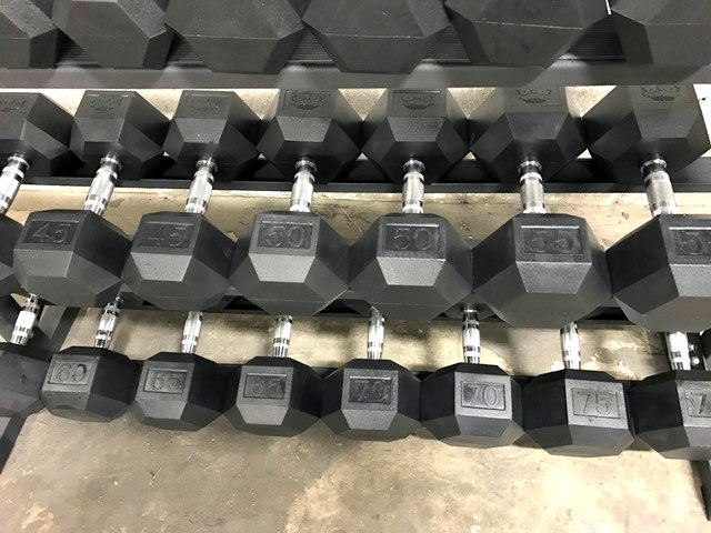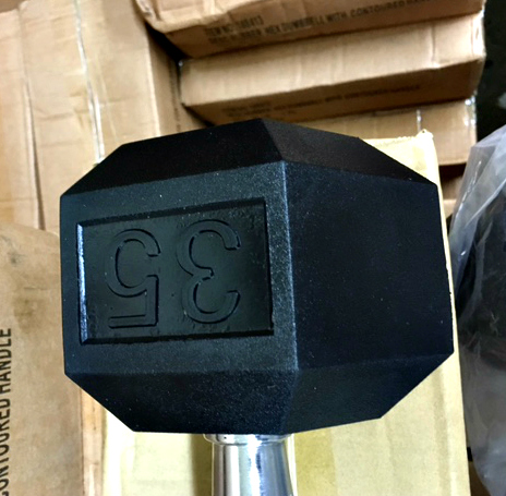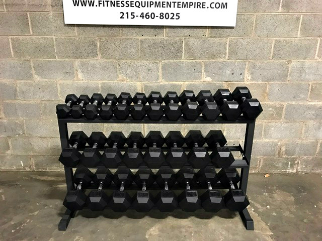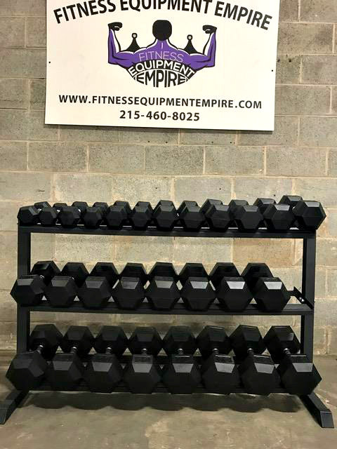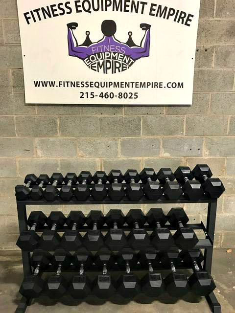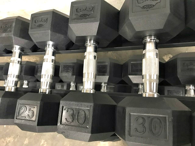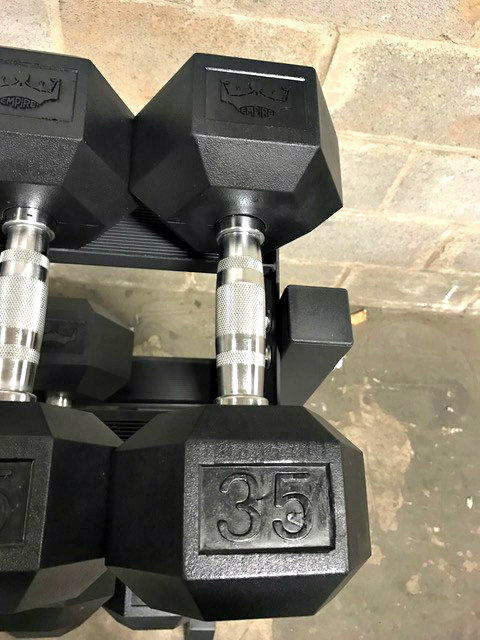 EMPIRE brand, rubber, hex dumbbell sets with chrome ergonomic handles. BRAND NEW in box! These are the best quality and the most inexpensive in the country, for new, commercial grade, rubber hex dumbbells!! Rack is not included.