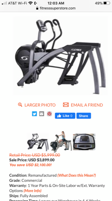 This is a super clean, current model of Cybex 750A Arc Trainer. The Cybex 750A Arc Trainer utilizes reverse arc motion technology, that engages the largest muscles groups in the legs and trunk to effectively burn the most calories, in the least amount of time. It provides a smooth, patented arc pattern that places the user’s toe behind the knee while pedaling, thus reducing stress on the joints allowing for a more comfortable workout experience. This unit has been cleaned, serviced, is in excellent condition and perfect working order. This unit sells elsewhere preowned for as much as $4,600.
