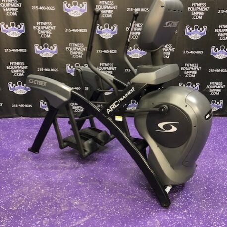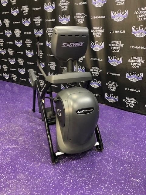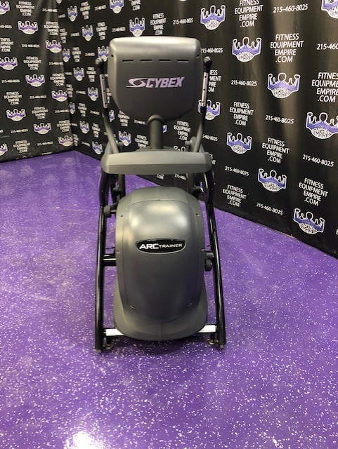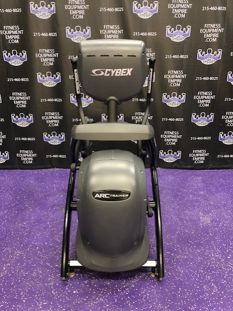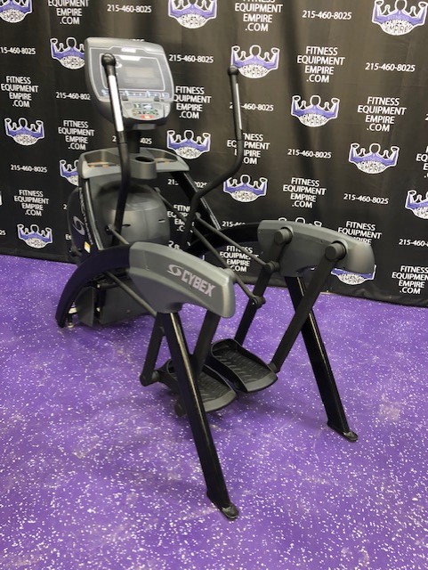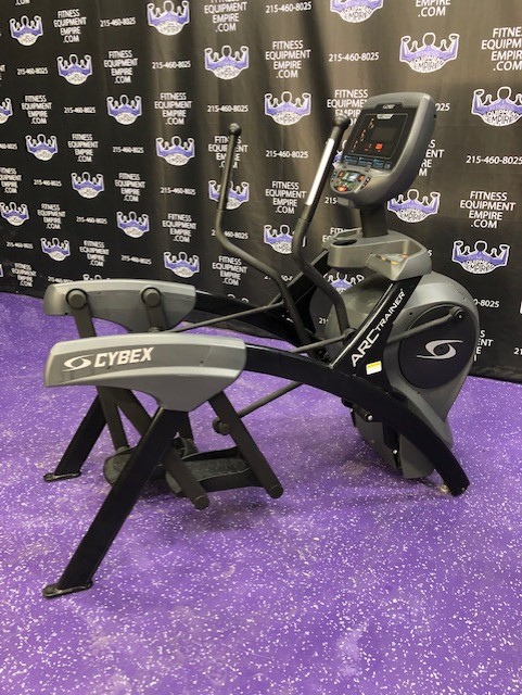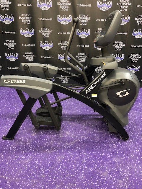 Cybex 610A Arc Trainer. The Cybex 610A Arc Trainer combines elements of a climber, cross-trainer and cross-country skier, and like other Cybex arc trainers, it’s designed to give the least amount of stress on joints, while maintaining the highest level of performance. This machine offers all of the award winning features of the 600A Arc Trainer, but adds arm handles conveniently designed with grips that enable you to put emphasis on either upper or lower body muscles. This is the patented Same Side Forward (SSF) configuration, which allows you to maintain correct posture at any degree of ramp incline. The high intensity user can lean forward without placing excess stress on the back. The reciprocal movement of the footplates allows for an accurate foot path in a natural (arc) motion, creating a relaxed feel. Four-bar linkage input arms keep the footplates at a constant angle with the floor – thereby reducing stress on the foot and ankle. Also similar to the 600A, the Total Body 610A offers extreme durability and can take whatever you dish out. The 610A’s movable arms create a curvilinear path that minimizes shoulder/elbow deviation and stress. The sturdy 610A also comes with front-mounted wheels to make the Arc Trainer more portable to preferred positions in your home and gym. These units are in excellent condition, working order and are being sold as is.