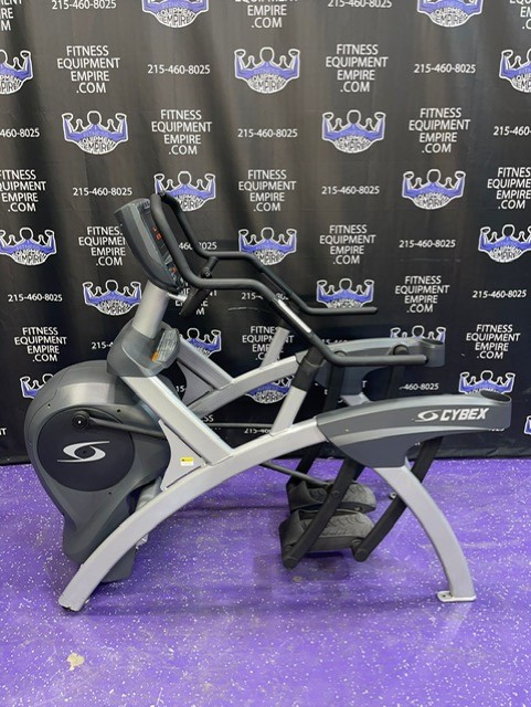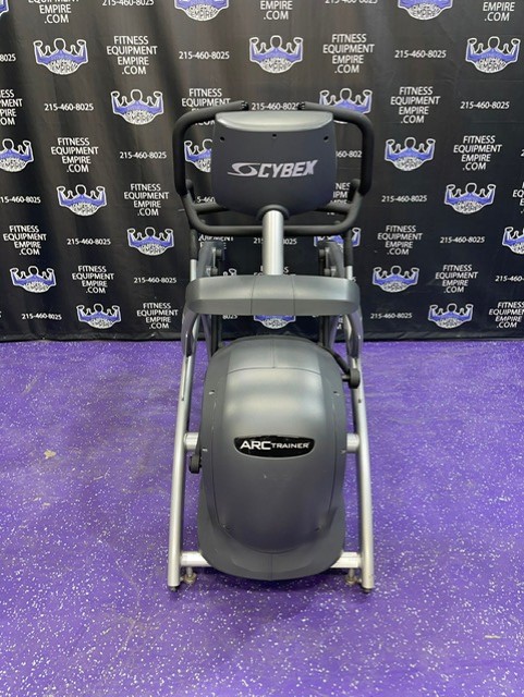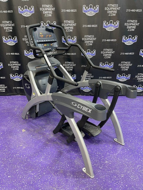 Cybex 610A Arc Trainer. The Cybex 610A Arc Trainer combines elements of a climber, cross-trainer and cross-country skier, and like other Cybex arc trainers, it’s designed to give the least amount of stress on joints, while maintaining the highest level of performance. This machine offers all of the award winning features of the 600A Arc Trainer, but adds arm handles conveniently designed with grips that enable you to put emphasis on either upper or lower body muscles. This is the patented Same Side Forward (SSF) configuration, which allows you to maintain correct posture at any degree of ramp incline. The high intensity user can lean forward without placing excess stress on the back. The reciprocal movement of the footplates allows for an accurate foot path in a natural (arc) motion, creating a relaxed feel. Four-bar linkage input arms keep the footplates at a constant angle with the floor – thereby reducing stress on the foot and ankle. Also similar to the 600A, the Total Body 610A offers extreme durability and can take whatever you dish out. The 610A’s movable arms create a curvilinear path that minimizes shoulder/elbow deviation and stress. The sturdy 610A also comes with front-mounted wheels to make the Arc Trainer more portable to preferred positions in your home and gym. These units are in excellent condition, working order and are being sold as is.