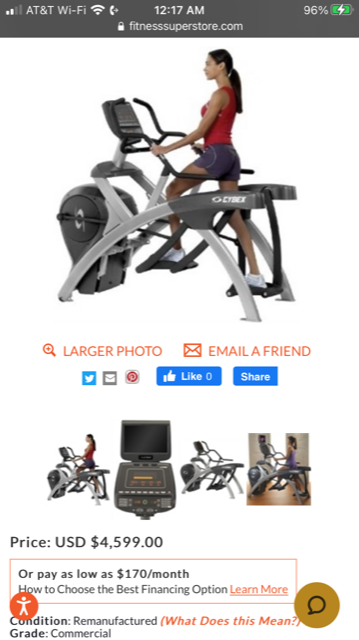 The Cybex 630a Arc Trainer is a professional high-end cross trainer created for the demanding customer. The Cybex arc trainer brings innovation to the art of fitness training. This one machine might be the most demanded cardio machine inside a popular health club. Adjustable incline provides variability in the pattern of motion. Low inclines provide a gliding action with modest hip and knee motion, while higher inclines provide comparable increases in hip and knee motion. Superior biomechanics allow for high intensity training that places high loads on the muscles with less stress on joints. Resistance range from 0 to 900 watts accommodates a wide variety of users, for those seeking a very low work rate to dedicated athletes demanding an extreme workout. This unit sells preowned elsewhere for as much as $4,400. A comparable new arc trainer costs as much as $8,000.
