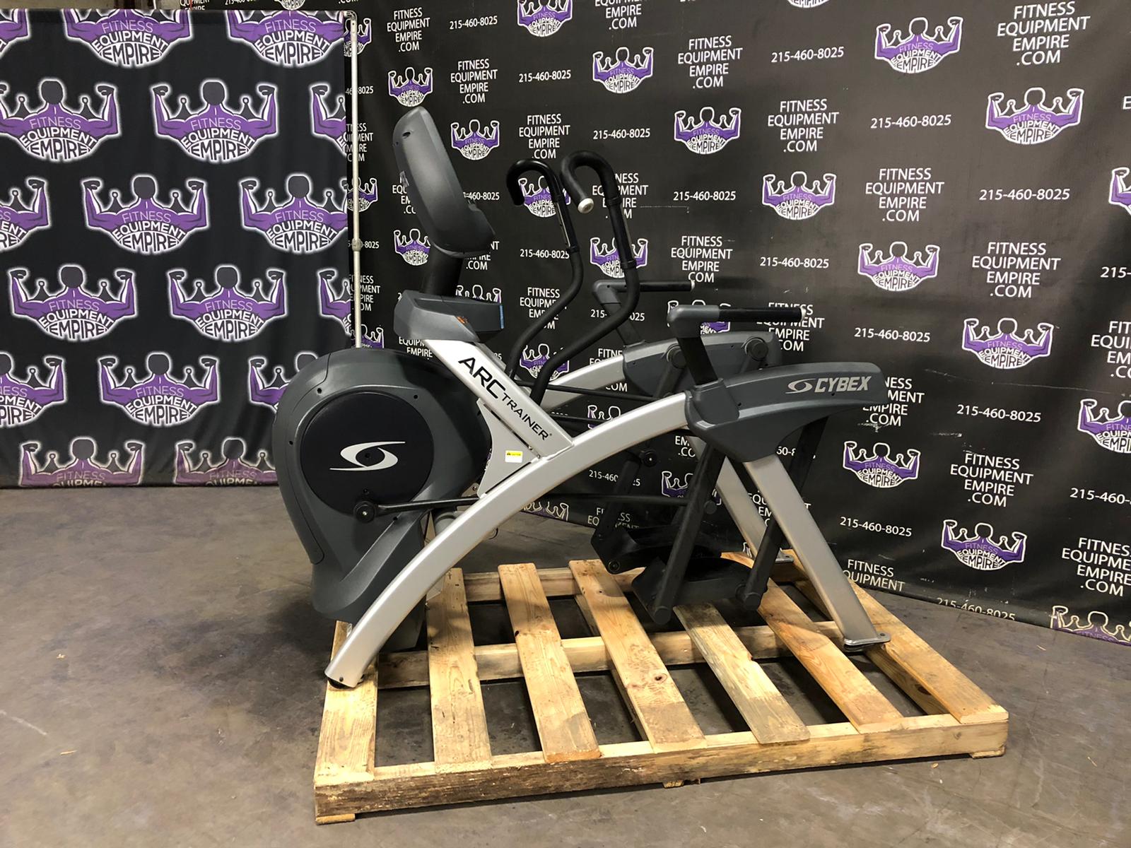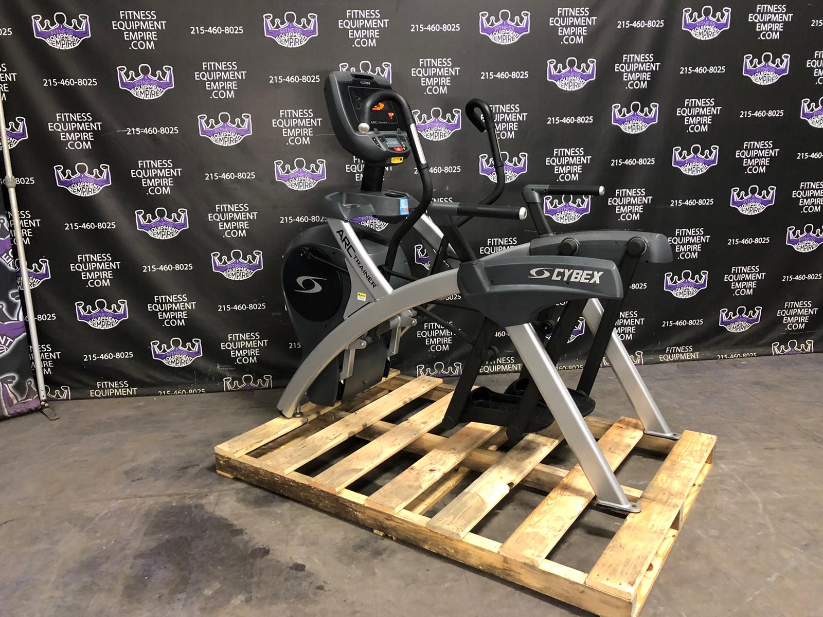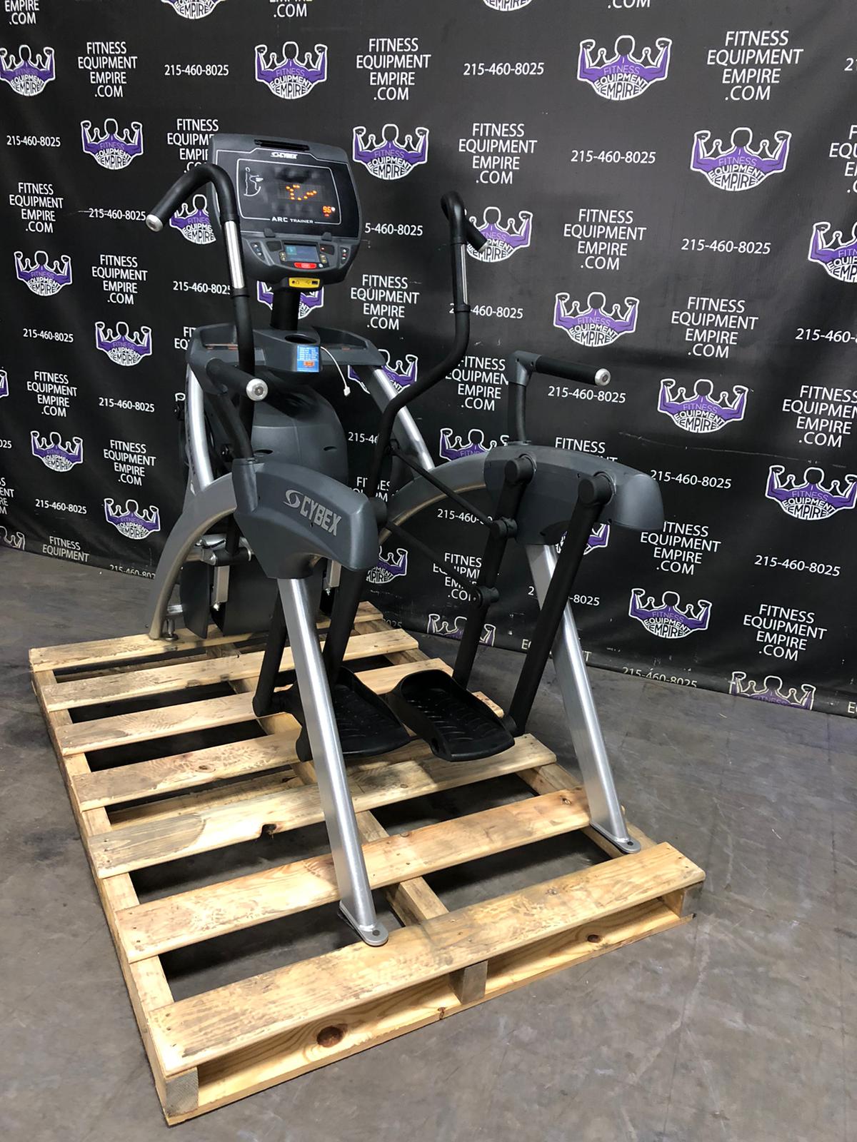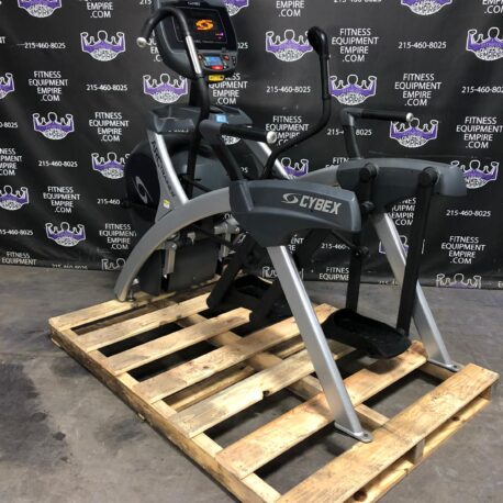 Cybex 610A Arc Trainer. The Cybex 610A Arc Trainer combines elements of a climber, cross-trainer and cross-country skier, and like other Cybex arc trainers, it’s designed to give the least amount of stress on joints, while maintaining the highest level of performance. This machine offers all of the award winning features of the 600A Arc Trainer, but adds arm handles conveniently designed with grips that enable you to put emphasis on either upper or lower body muscles. This is the patented Same Side Forward (SSF) configuration, which allows you to maintain correct posture at any degree of ramp incline. The high intensity user can lean forward without placing excess stress on the back. The reciprocal movement of the footplates allows for an accurate foot path in a natural (arc) motion, creating a relaxed feel. Four-bar linkage input arms keep the footplates at a constant angle with the floor – thereby reducing stress on the foot and ankle. Also similar to the 600A, the Total Body 610A offers extreme durability and can take whatever you dish out. The 610A’s movable arms create a curvilinear path that minimizes shoulder/elbow deviation and stress. The sturdy 610A also comes with front-mounted wheels to make the Arc Trainer more portable to preferred positions in your home and gym. These units are in excellent condition, working order and are being sold as is.