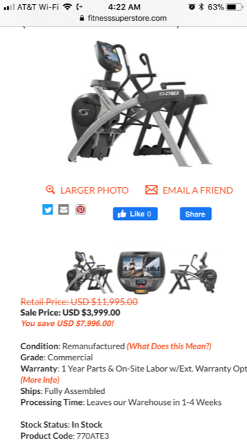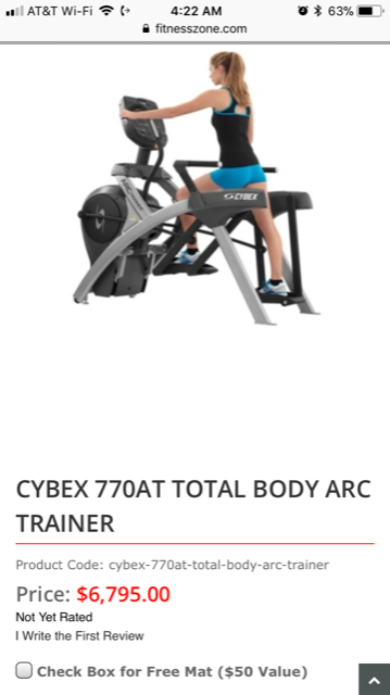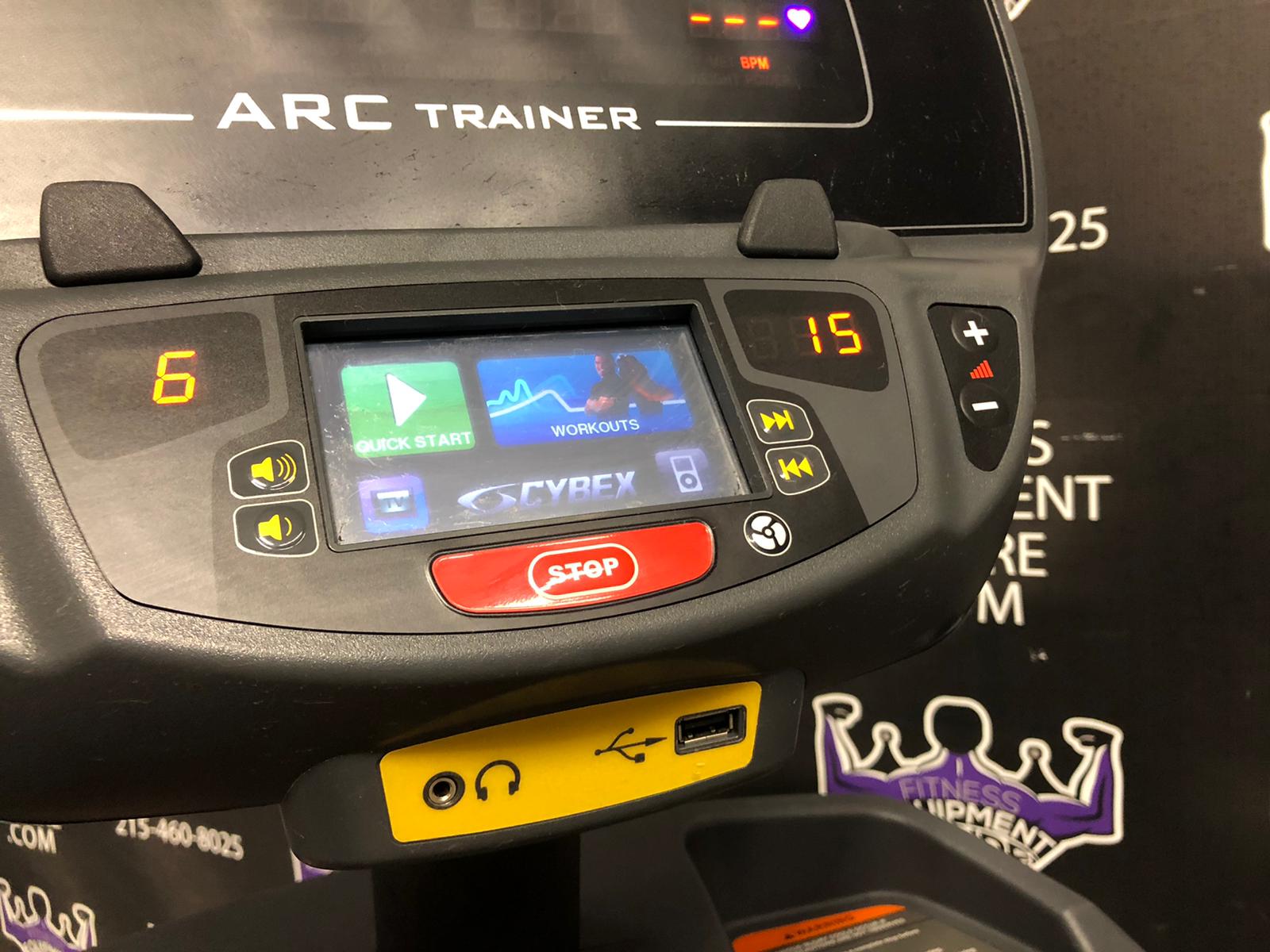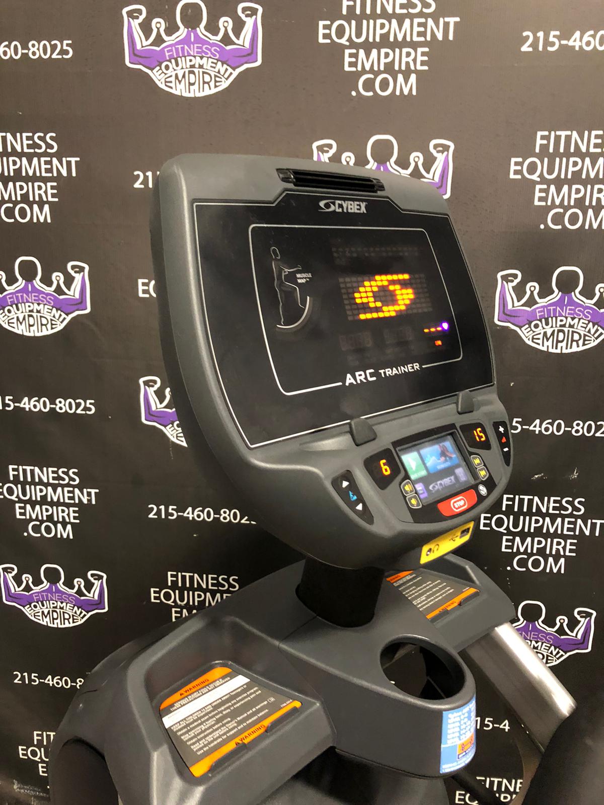 The Cybex 630a Arc Trainer is a professional high-end cross trainer created for the demanding customer. The Cybex arc trainer brings innovation to the art of fitness training. This one machine might be the most demanded cardio machine inside a popular health club. Adjustable incline provides variability in the pattern of motion. Low inclines provide a gliding action with modest hip and knee motion, while higher inclines provide comparable increases in hip and knee motion. Superior biomechanics allow for high intensity training that places high loads on the muscles with less stress on joints. Resistance range from 0 to 900 watts accommodates a wide variety of users, for those seeking a very low work rate to dedicated athletes demanding an extreme workout. This unit sells preowned elsewhere for as much as $4,400. A comparable new arc trainer costs as much as $8,000.