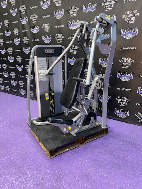 BRAND NEW Empire 8-stack jungle gym/cable crossover with 320 lb. weight stacks! 2.5” x 4.5” rugged, 11-gauge steel and oval tubing for that extra beefy appearance. Unit has high tension cables; multi chin grips that are fabricated with smooth rubber and finished with high-tech aluminum ends and collars. Stations interchange around the central hub for a possible 12-stack, L-shaped jungle gym. Options allow the substitution of 2 hi/low adjustable pulley columns replacing the tricep press down stations found on the Deluxe 8-stack version B (MDM-8SB).