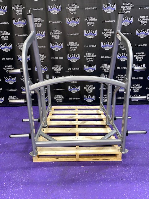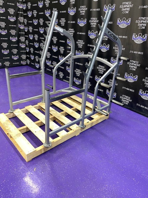 The Cybex Squat Rack features eight different racking positions spaced 4” apart. There are five zinc-coated plate storage pegs per side with polymer bumpers on storage pegs to protect the frame finish from weight plate damage. This unit retails for $2,200 as shown below.