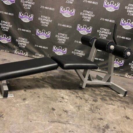 Life Fitness Signature Series adjustable decline abdominal bench on wheels. This is the current and latest model bench offered by Life Fitness. This bench is great for crunches, but also for pressing movements. Can be used free standing, in the Smith Machine or squat rack, with a barbell or dumbbells. Bench retails new for $1,400 and sells preowned elsewhere for $1,000.