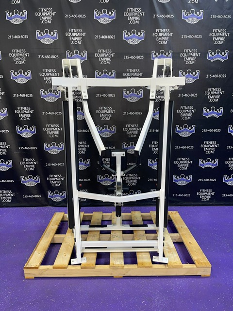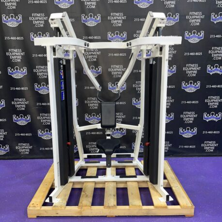 BRAND NEW Empire 8-stack jungle gym/cable crossover with 320 lb. weight stacks! 2.5” x 4.5” rugged, 11-gauge steel and oval tubing for that extra beefy appearance. Unit has high tension cables; multi chin grips that are fabricated with smooth rubber and finished with high-tech aluminum ends and collars. Stations interchange around the central hub for a possible 12-stack, L-shaped jungle gym. Options allow the substitution of 2 hi/low adjustable pulley columns replacing the tricep press down stations found on the Deluxe 8-stack version B (MDM-8SB).