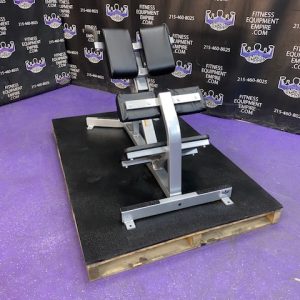 Hammer Strength 45 degree hyper extension in excellent condition. This is a very popular color offered by Hammer Strength. This is one of the most popular and well liked hyper extensions on the market. Comfortable design and padding, large footplate, perfect angle and built like a tank. This is a very functional unit in that you can train a number of muscle groups on one unit in a very limited space. Train back, abs, obliques, hamstrings and glutes.