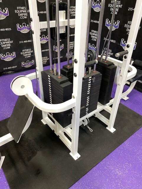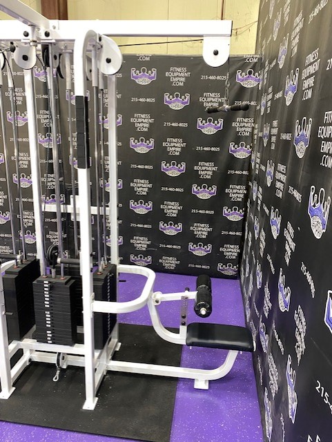 BRAND NEW Empire 8-stack jungle gym/cable crossover with 320 lb. weight stacks! 2.5” x 4.5” rugged, 11-gauge steel and oval tubing for that extra beefy appearance. Unit has high tension cables; multi chin grips that are fabricated with smooth rubber and finished with high-tech aluminum ends and collars. Stations interchange around the central hub for a possible 12-stack, L-shaped jungle gym. Options allow the substitution of 2 hi/low adjustable pulley columns replacing the tricep press down stations found on the Deluxe 8-stack version B (MDM-8SB).