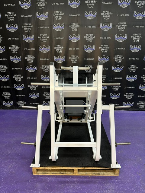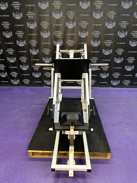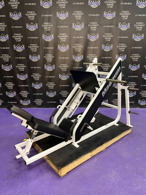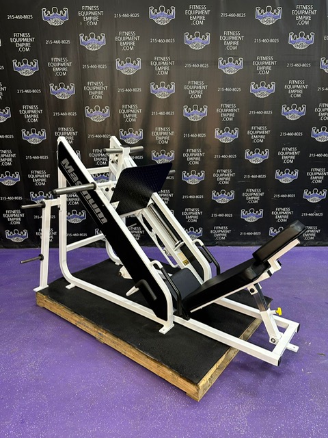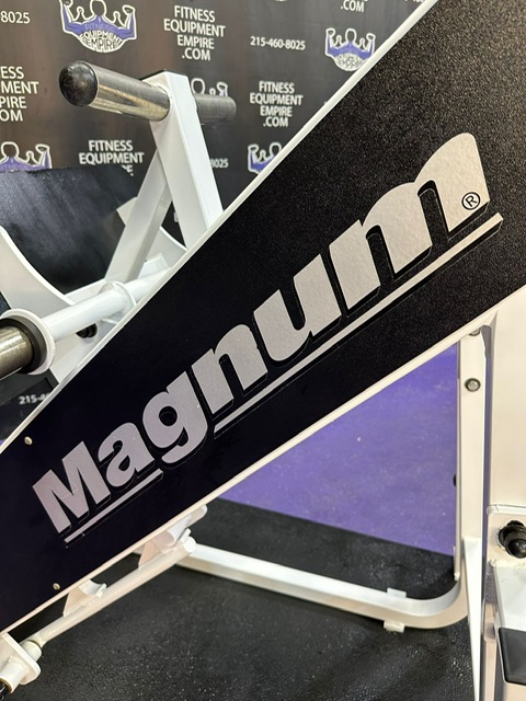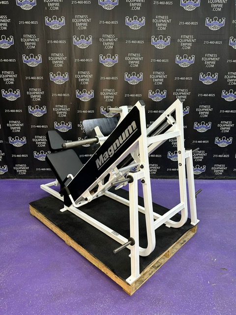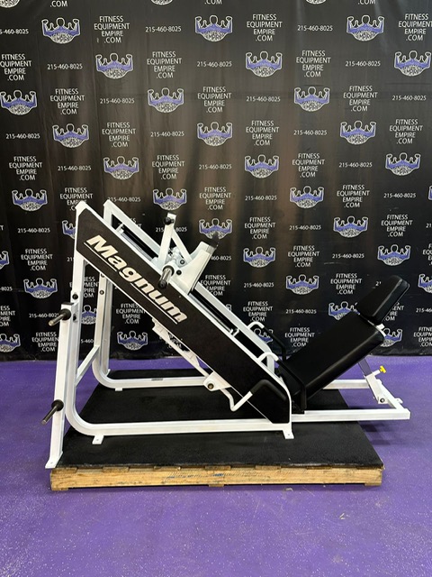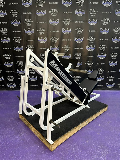 Magnum 45 degree plate loaded linear leg press. This is a classic unit that is built like a tank and will help blast your legs. This machine has a perfect angle and smooth linear bearings. This unit has a large foot plate that allows for various foot positions. This leg press has some cosmetic wear and is in excellent working order. Comparable machines sell new in excess of $5,000.