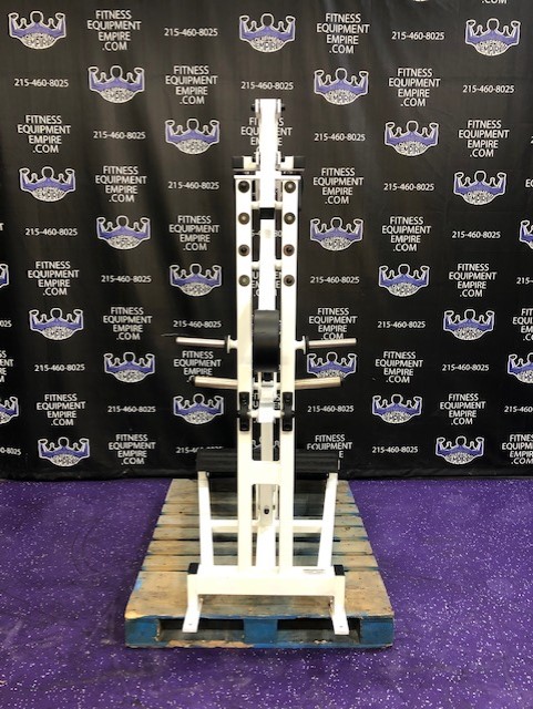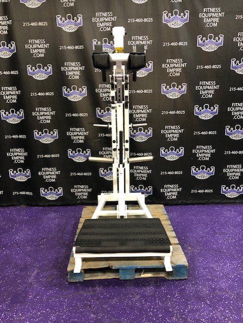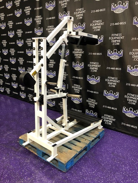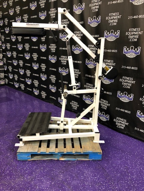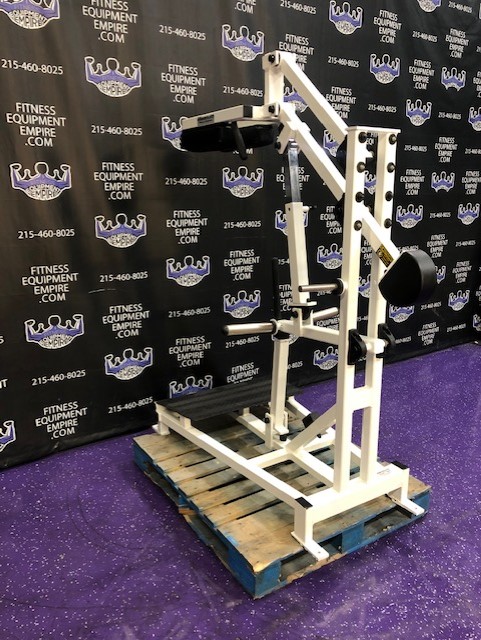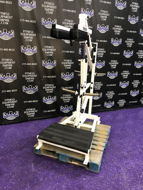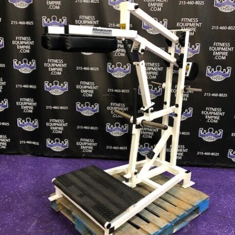 Magnum plate loaded perfect squat & calf. This machine is in excellent condition. This is a total lower body unit. You can blast your quads, hamstrings, glutes and calves with this machine. It is super effective, natural and easy on the joints. This machine will hold a ton of weight, but certainly doesn’t require it to get a great exercise. It’s definitely true to weight, unlike with some machines you can pile on 30 plates and it still feels light. That’s great for ego but not much else. This unit is quite RARE and doesn’t come around too often.
