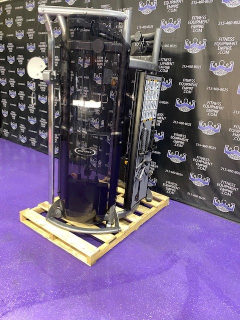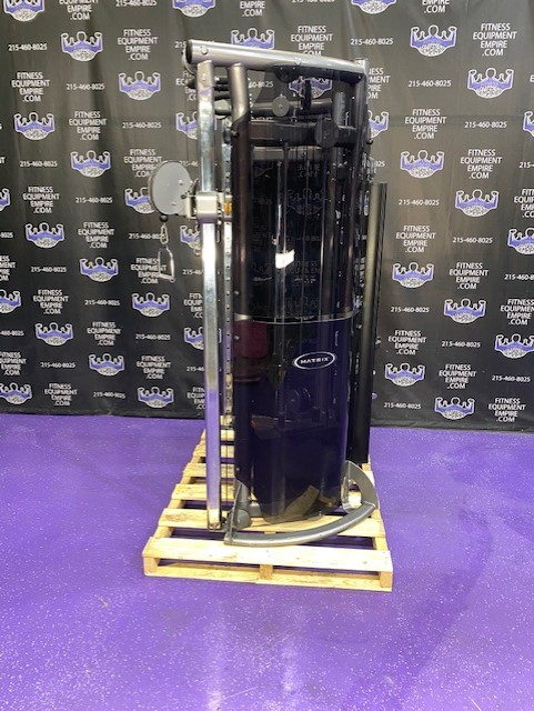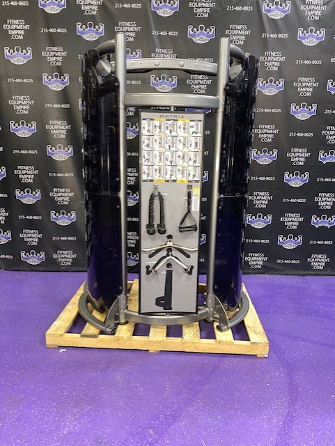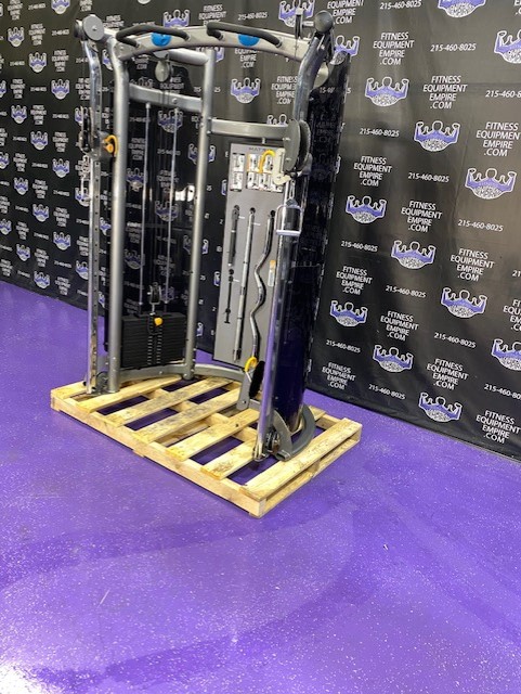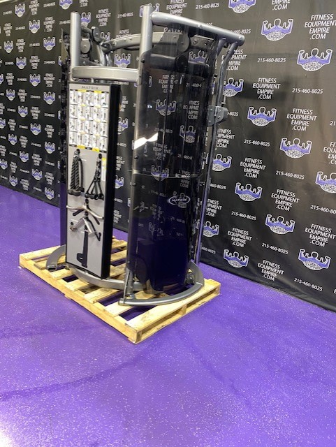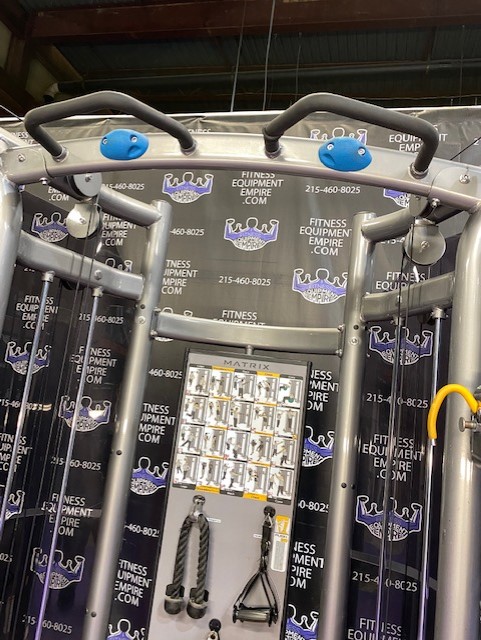 BRAND NEW Empire 8-stack jungle gym/cable crossover with 320 lb. weight stacks! 2.5” x 4.5” rugged, 11-gauge steel and oval tubing for that extra beefy appearance. Unit has high tension cables; multi chin grips that are fabricated with smooth rubber and finished with high-tech aluminum ends and collars. Stations interchange around the central hub for a possible 12-stack, L-shaped jungle gym. Options allow the substitution of 2 hi/low adjustable pulley columns replacing the tricep press down stations found on the Deluxe 8-stack version B (MDM-8SB).