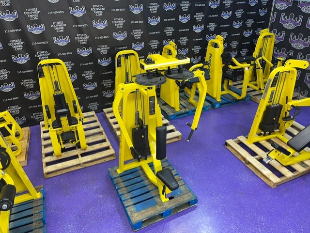 BRAND NEW Empire 8-stack jungle gym/cable crossover with 320 lb. weight stacks! 2.5” x 4.5” rugged, 11-gauge steel and oval tubing for that extra beefy appearance. Unit has high tension cables; multi chin grips that are fabricated with smooth rubber and finished with high-tech aluminum ends and collars. Stations interchange around the central hub for a possible 12-stack, L-shaped jungle gym. Options allow the substitution of 2 hi/low adjustable pulley columns replacing the tricep press down stations found on the Deluxe 8-stack version B (MDM-8SB).