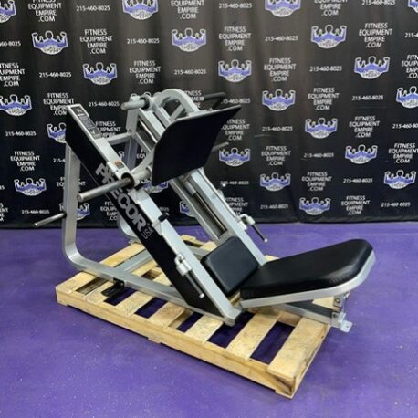 Precor Icarian 601 45-degree plate loaded linear leg press with extra loading horn. This unit is in great condition. This is a classic, original, highly favored and sought-after leg press. Built like a tank with the perfect angle, and silky-smooth linear bearings, are a few reasons why this is considered one of the best leg presses of all time. This unit also has a large foot plate for various foot positions. This leg press also has a smaller footprint than most.
