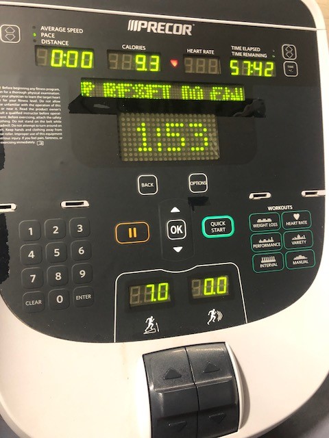 Electronic Readouts: Speed, Incline, Distance, Pace, Average, Speed, Calories, Heart Rate, Time Elapsed, Time Remaining, % Complete, Time in Zone, Segment Time, Cals/min, Cals/hr, watts, METS, Target HR, Average HR, Elevation Gain, Workout Profile, Workout Summary