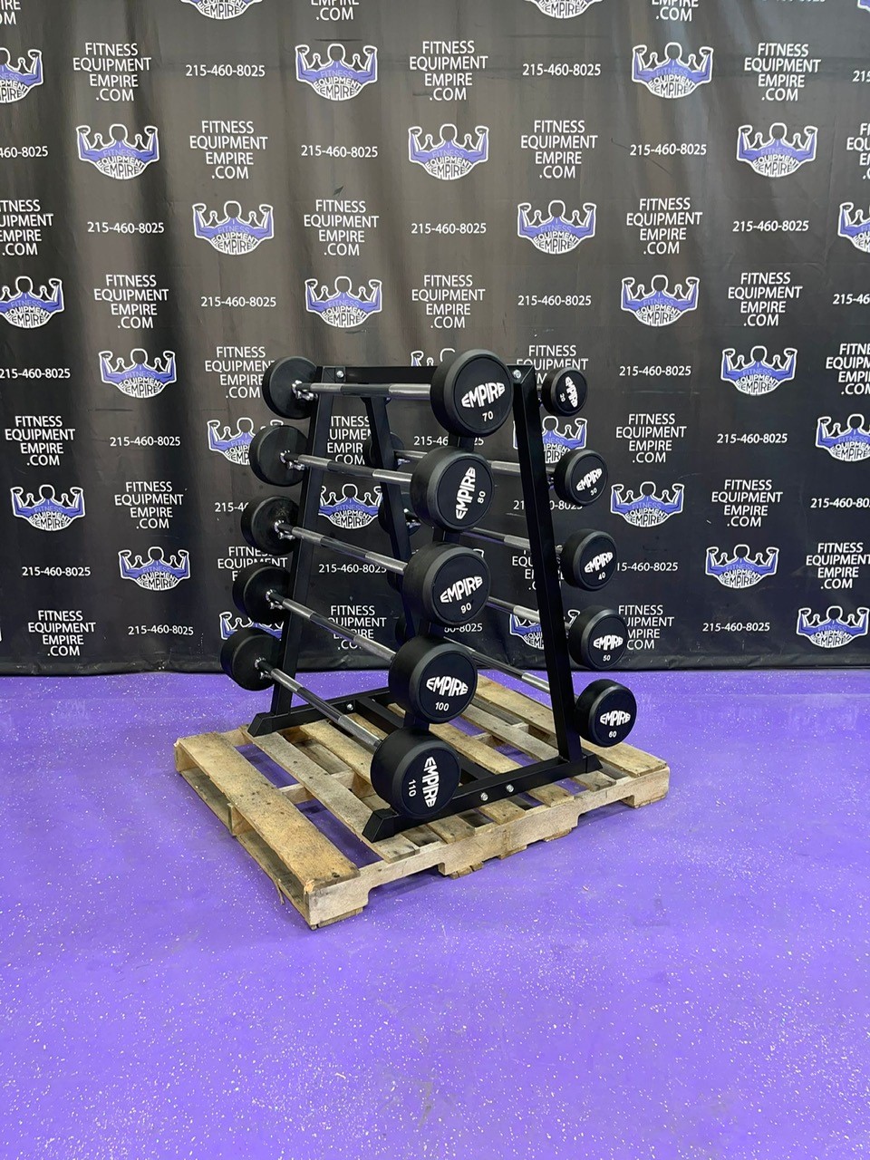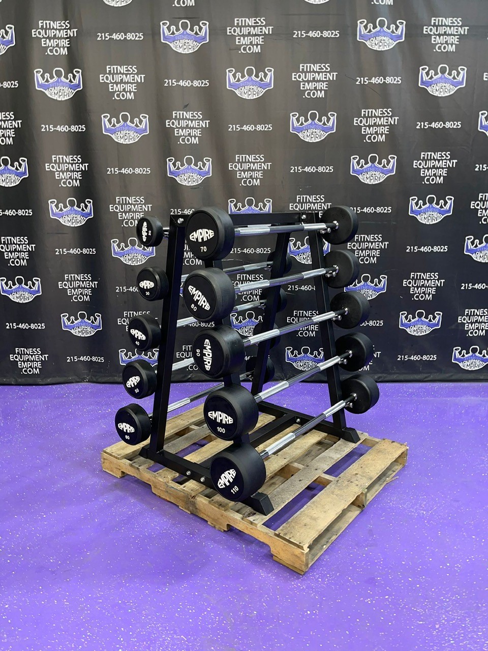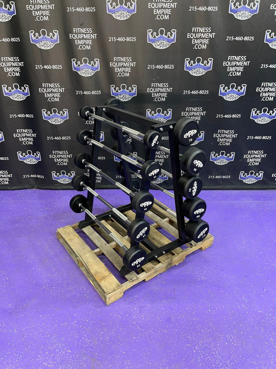 BRAND NEW set of Empire fixed rubber covered straight bars. 20-110 lbs. in 10 lb. increments with rack! This are full commercial grade, beautiful, well constructed fixed bars that will compete with any big box commercial brand. Comparable fixed bar sets sell for as much as $4,000 without the racks! Incredible pricing for this product!BRAND NEW Empire Rubber Covered Fixed Straight Bar Set 20-110 lbs