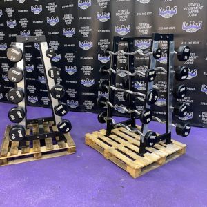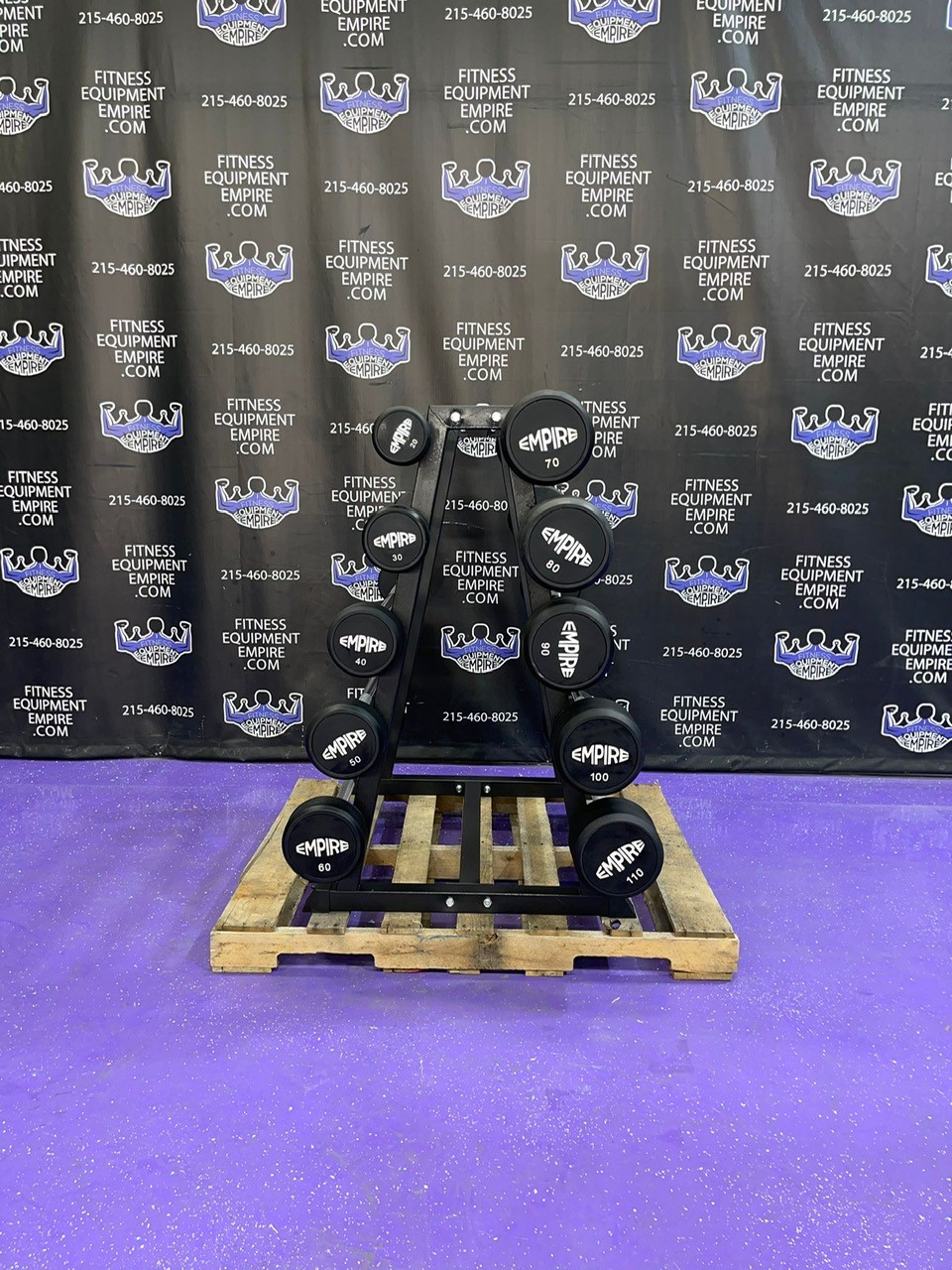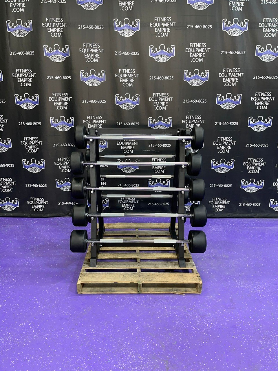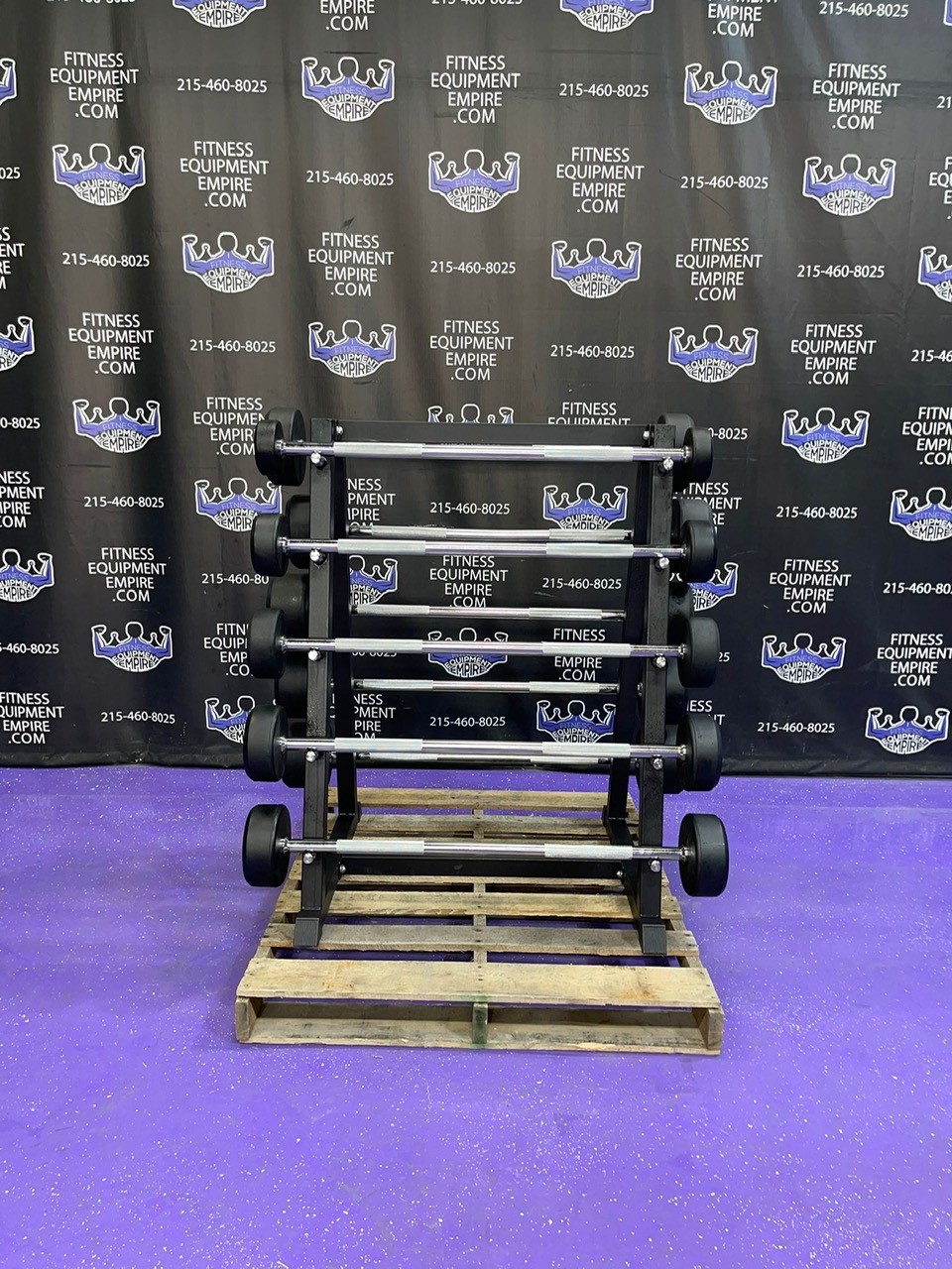 BRAND NEW set of Empire fixed rubber covered straight bars. 20-110 lbs. in 10 lb. increments with rack! This are full commercial grade, beautiful, well constructed fixed bars that will compete with any big box commercial brand. Comparable fixed bar sets sell for as much as $4,000 without the racks! Incredible pricing for this product!BRAND NEW Empire Rubber Covered Fixed Straight Bar Set 20-110 lbs