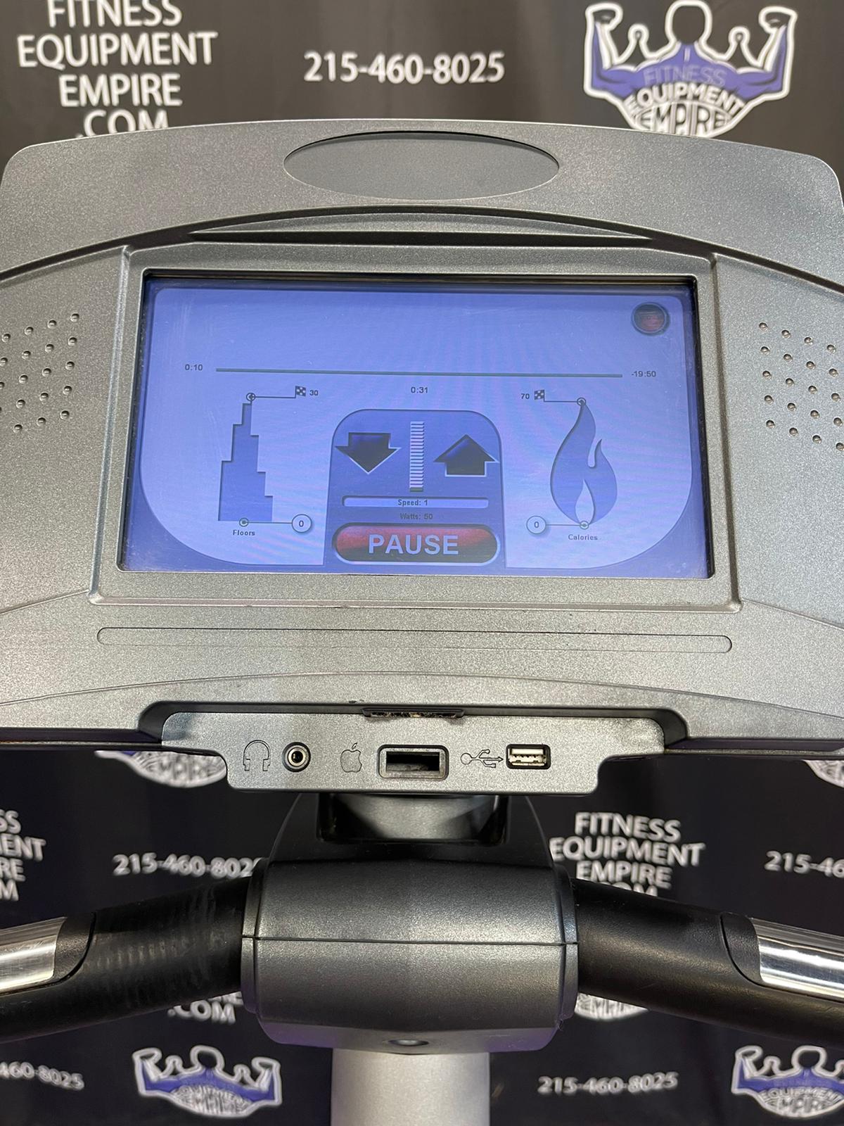 - Large 10” touch screen displays time, interval timer, level (1-20), heart rate, calories, floors climbed, floors per minute, watts, METs and workout profile