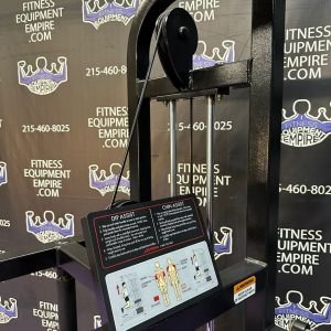 BRAND NEW Empire 8-stack jungle gym/cable crossover with 320 lb. weight stacks! 2.5” x 4.5” rugged, 11-gauge steel and oval tubing for that extra beefy appearance. Unit has high tension cables; multi chin grips that are fabricated with smooth rubber and finished with high-tech aluminum ends and collars. Stations interchange around the central hub for a possible 12-stack, L-shaped jungle gym. Options allow the substitution of 2 hi/low adjustable pulley columns replacing the tricep press down stations found on the Deluxe 8-stack version B (MDM-8SB).