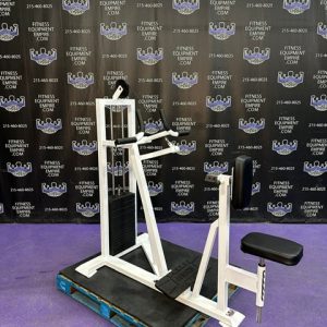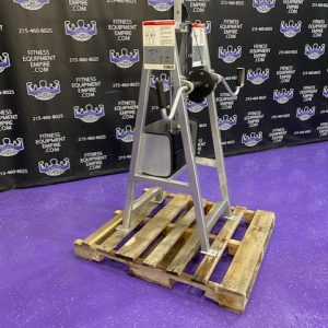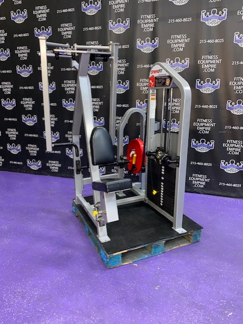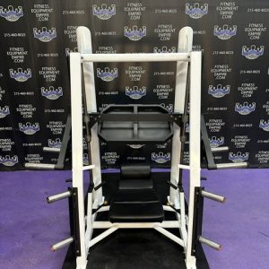 Hammer Strength plate loaded ISO lateral jammer press. This is essentially a standing chest press, (you can also add an adjustable bench and perform seated presses). These are often used by athletes, football players, etc. It’s a very powerful movement that will greatly increase your upper body strength, chest and shoulder development. These units are very common in NFL and NCAA training facilities. Unit is priced to sell.