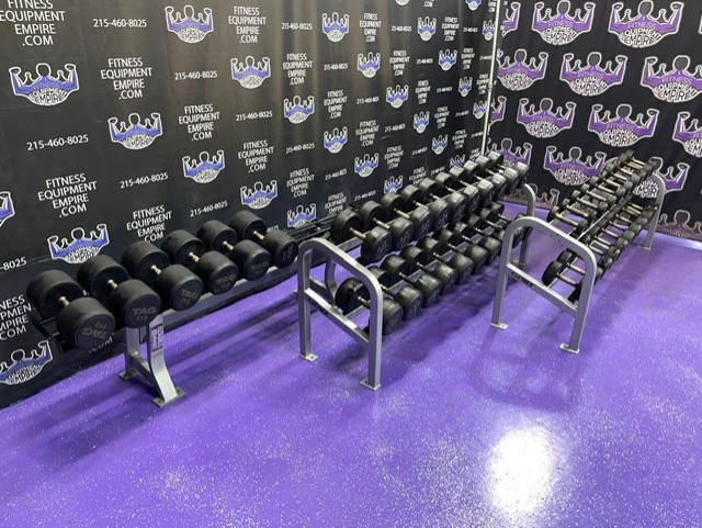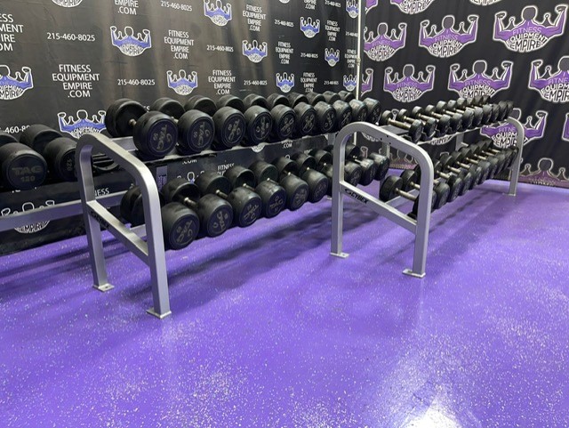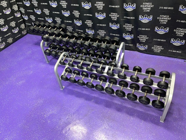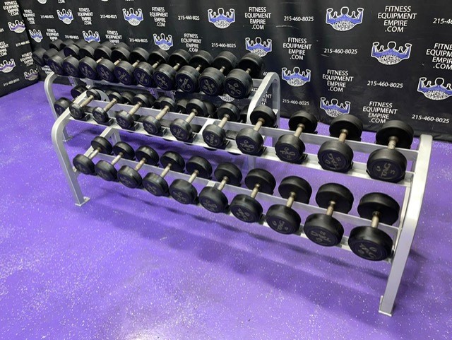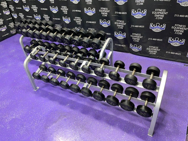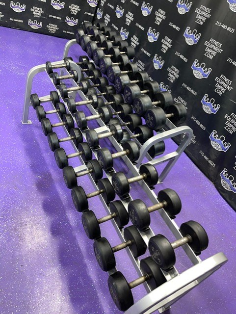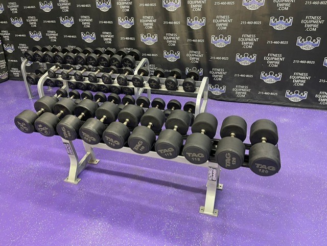 High end commercial grade TAG Rubber Round 5-120 lb. Dumbbell Set w/3 Racks. These are preowned but still in great shape and have many, many more years of use. They retail new for nearly $6 per lb.! We are asking a fraction of that. The set is from 5-120 lbs. in 5 lb. increments. The 70 lb. pair is a slightly different style.3,000 lbs. total + 3 pro racks (2 Cybex and 1 Hammer Strength).